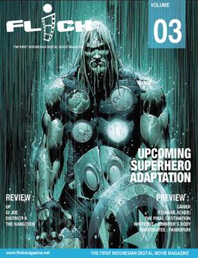 | Flick Magazine #3 07 Oktober 2010 | Saya mewakili tim redaksi dan seluruh kru Flick Magazine mengucapkan Mohon Maaf Lahir dan Batin, Selamat Hari Raya Idul Fitri 1430 H. Maafkan kami jika ada penulisan atau hal-hal lain yang membuat para pembaca tidak merasa berkenan di hati. Dalam cover story edisi September ini, Flick akan membahas apa-apa saja film superhero besar yang sekiranya akan menarik perhatian publik dalam bentuk adaptasi pertama mereka ke layar lebar di tahun-tahun mendatang. Diantaranya kami akan membahas Thor, Captain America, Green Hornet, bahkan rencana studio-studio besar untuk mengangkat karakter superhero dari komik terbitan Marvel & DC Comics.Untuk film nasional, Flick akan menghadirkan ... More |