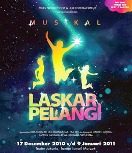 Ketika saya menginjakkan kaki di Teater Jakarta Taman Ismail Marzuki sore itu, tak terbayangkan bahwa saya akan menyaksikan sebuah pertunjukan musikal yang tidak hanya pantas, namun juga luar biasa. Saya mengetahui bahwa Musikal Laskar Pelangi adalah proyek besar yang dikerjakan oleh nama-nama yang juga besar, sebuah karya ambisius yang melibatkan insan-insan berbakat dalam negeri. Walau demikian, ekspektasi saya tidak terlalu tinggi. Mungkin karena terlalu ramainya euforia yang terjadi, atau karena ekspektasi saya yang memang tidak pernah menjulang, saya tak tahu pasti. Yang jelas, seusai menonton, saya keluar dari Teater Jakarta dengan sebuah kepuasan tak terhingga yang tidak saya bayangkan sebelumnya. Sebuah kebahagiaan dan senyuman yang tertera di wajah, dan bait-bait lagu yang terngiang-ngiang di kepala.